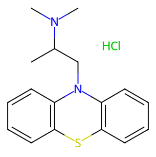Promethazine Hydrochloride blocks H1 receptors in smooth muscles, capillary walls, and other tissues, competitively antagonizing the effects of histamine. It also exhibits significant central nervous system depressant effects, enhancing the actions of anesthetics, hypnotics, and analgesics, while reducing body temperature and controlling nausea and vomiting.