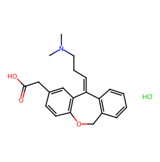 Olopatadine Hydrochloride, the hydrochloride salt of Olopatadine, exhibits dual actions of inhibiting histamine release and selectively antagonizing H1 receptors. It stabilizes mast cells and prevents histamine release from these cells, while also blocking histamine H1 receptors, thereby preventing histamine from binding to these receptors. Both actions prevent the effects of histamine on capillaries, bronchial smooth muscles, and gastrointestinal smooth muscles, including histamine-induced vasodilatation, increased capillary permeability, bronchoconstriction, and gastrointestinal smooth muscle spasms. Additionally, it prevents histamine-induced mucosal pain and itching.